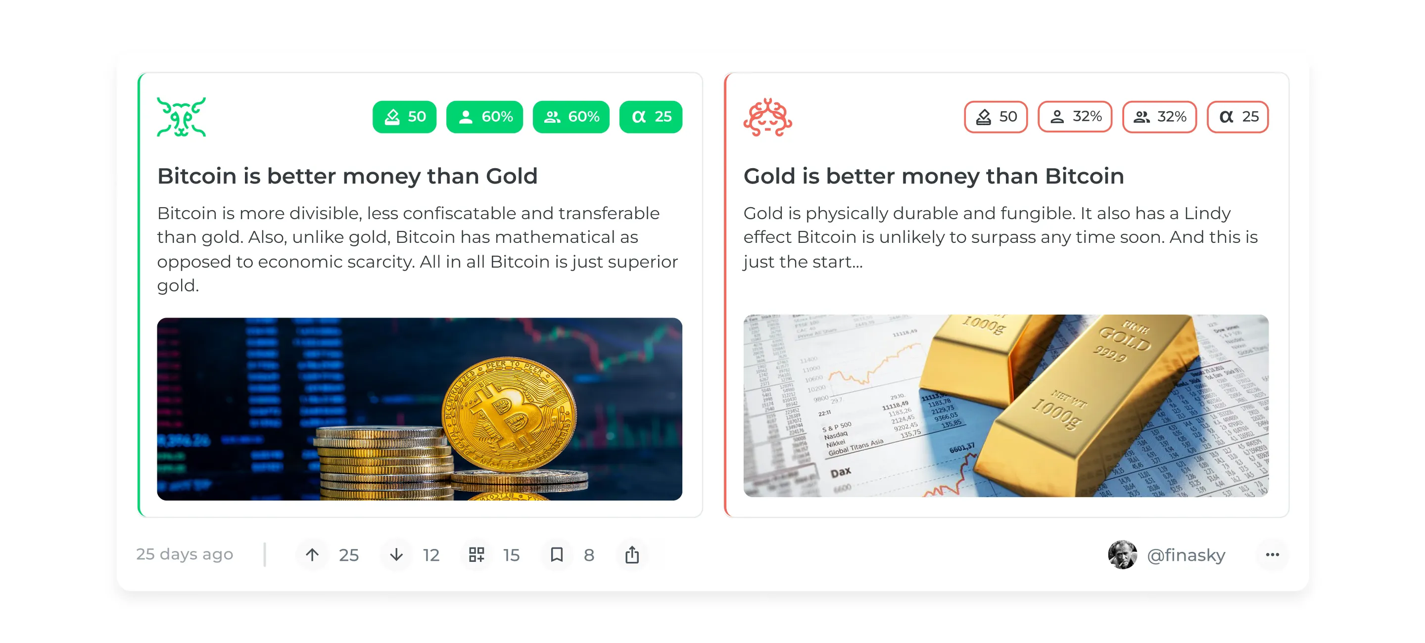 Every asset should have one D1 analyst. To claim the title, you publish concise, logic-driven valuations backed by ViPs—Views Inferred from Premises. ViPs are investment arguments distilled into 80 characters or less. If readers prefer your reasoning, you earn Olives—our points program. That’s how you climb the leaderboard.