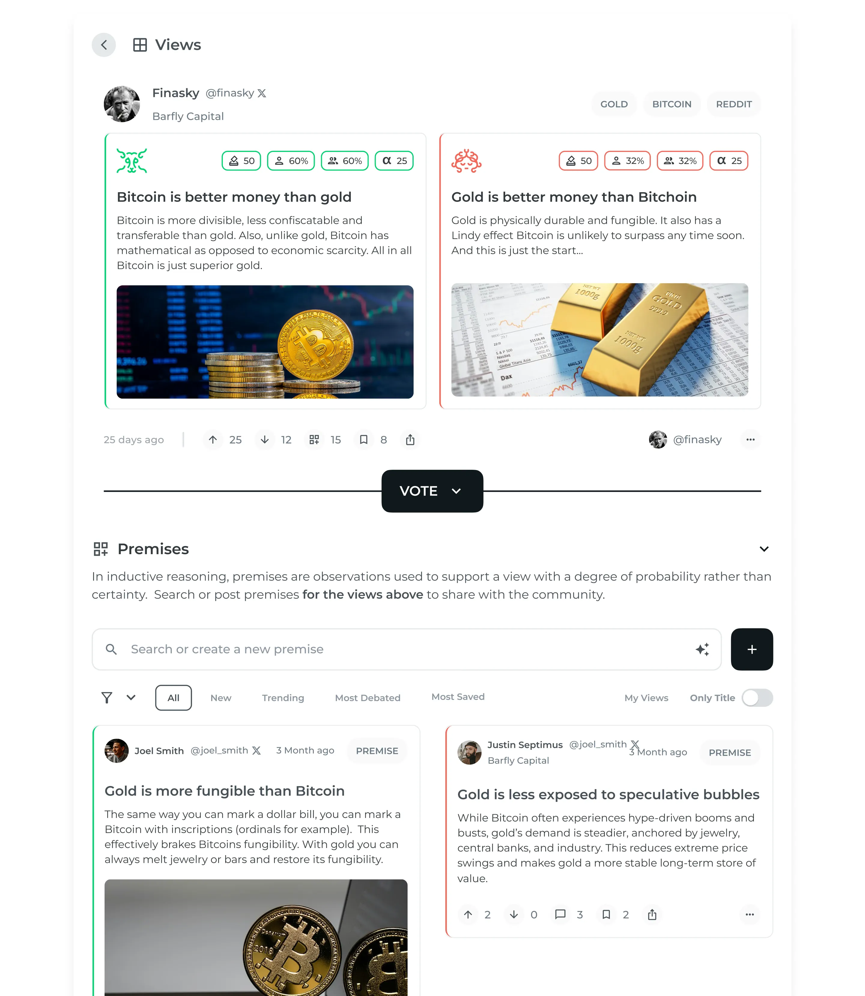 We want your boldest, most opinionated investment takes. But remember: every View you publish spawns an automatic Counter-View. That’s by design. You want a space for others to point out how you are wrong. The beauty of reasoning is that when opposing arguments are laid out clearly, it becomes harder to ignore them. The goal is to make changing your mind not just possible, but natural.