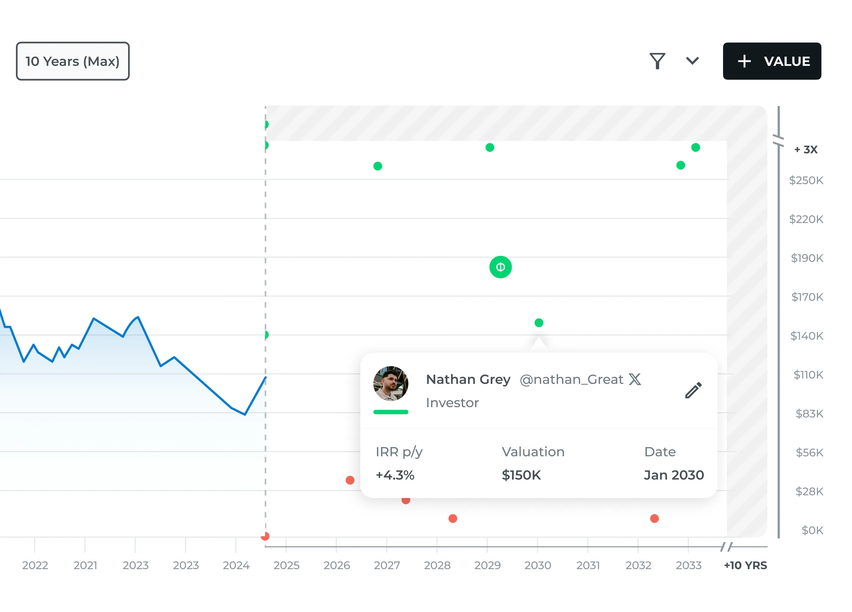 When published, your Valuation appears on the Prices & Values graph alongside the community average and John Maven’s baseline, making your reasoning directly comparable to others’.