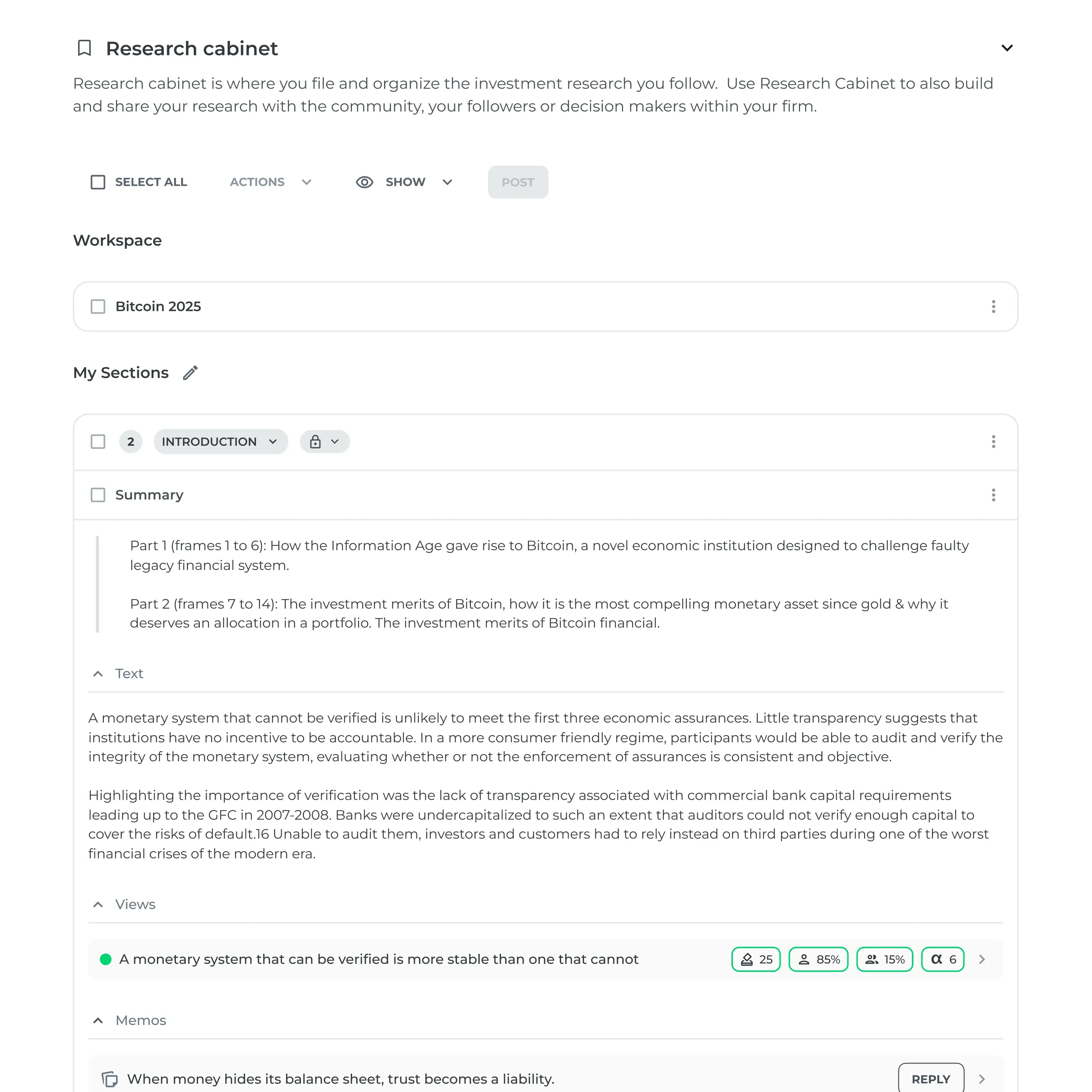 Think of it as both an archive and a staging ground. You can group items into Folders, structure them into Sections, and decide what stays private versus what you share. When ready, you can post Outlooks from your Cabinet.